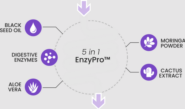 A unique blend of enzymes + botanicals (aloe vera, black seed oil, moringa, cactus, and digestive enzymes) that works in harmony to break down carbs, fats, and dairy while soothing gut irritation.