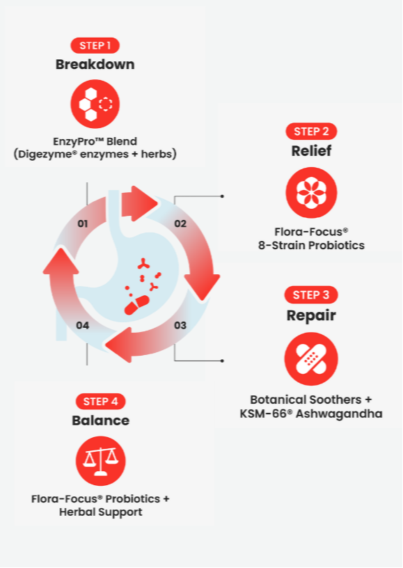 Powered by 8-strain, 20 billion CFUs Flora-Focus® probiotics, DigeZyme® enzymes, EnzyPro™ botanicals, and KSM-66® Ashwagandha — a thoughtfully formulated blend featuring advanced micro-encapsulation.