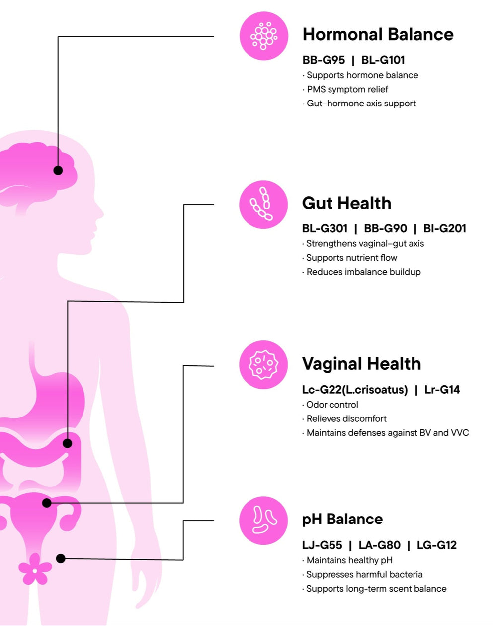 Lc-G22 supports strong colonization, limiting harmful bacteria and promoting natural cell renewal. This helps stabilize vaginal microbiota and is clinically linked to lower bacterial vaginosis (BV).